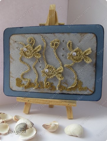 Открытка Ассамбляж, Вязание крючком: Открытка "Золотые рыбки" Бисер, Бумага, Пряжа. Фото 3